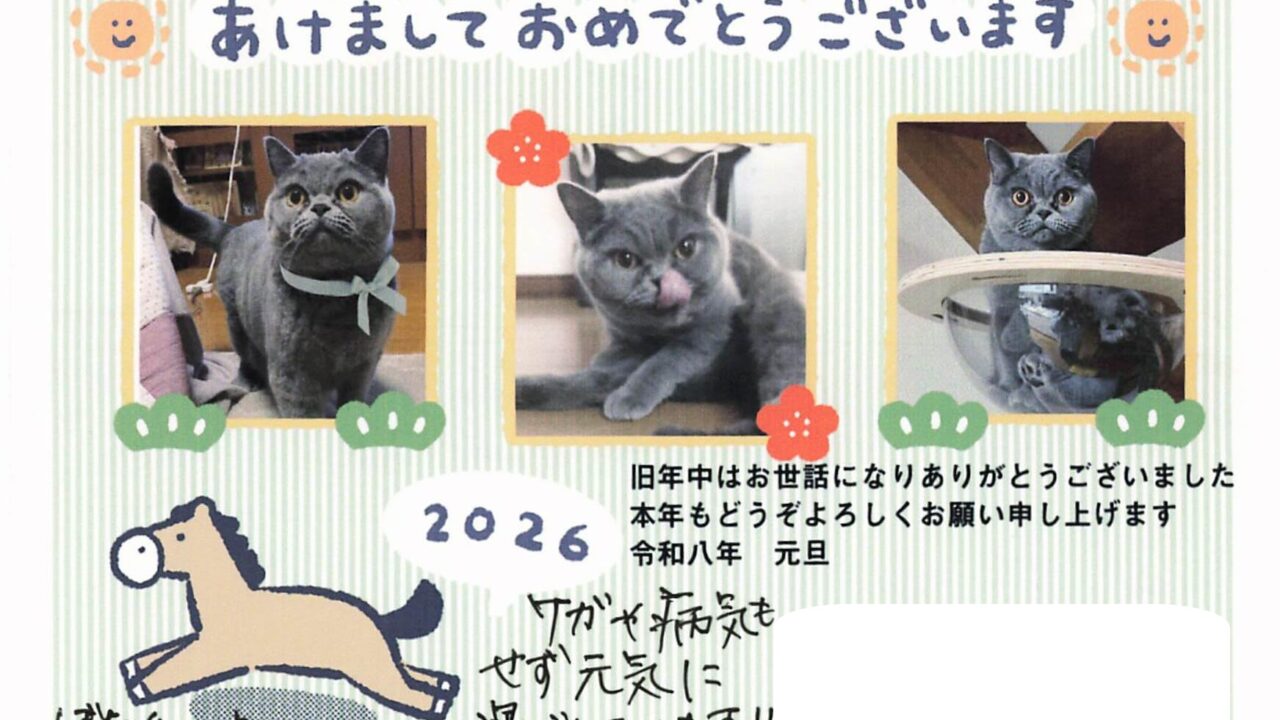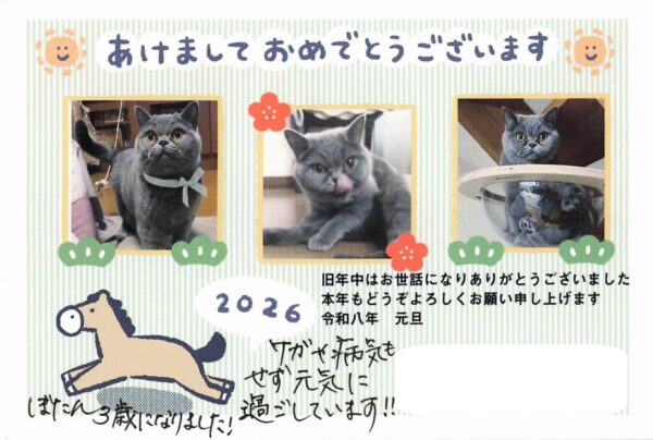 お便りのご紹介 ブリティッシュショートヘア 女の子 ぼたんちゃん(2022.09.09生まれ) 飼い主様のお便り royalcat 2026年1月2日 / 2026年1月5日 埼玉県さいたま市のM様より2026年の年賀状 愛猫:ぼたんちゃん(2022.09.09生) ケガや病気もせず元気に過ごしています!! ぼたん3歳になりました! 【お迎えの日 2022.12.09】